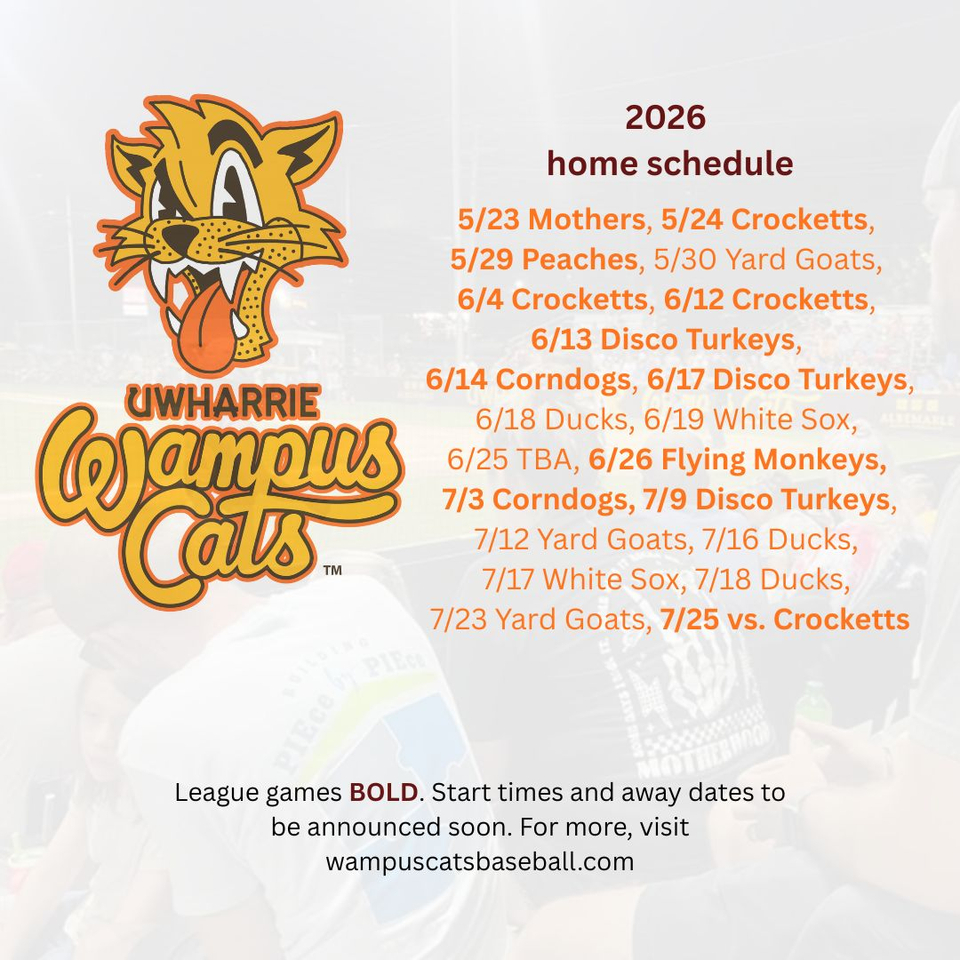 The Uwharrie Wampus Cats have unveiled their 2026 home schedule, bringing another full summer of college wood-bat baseball to Albemarle and the first in the Blue Ridge League.